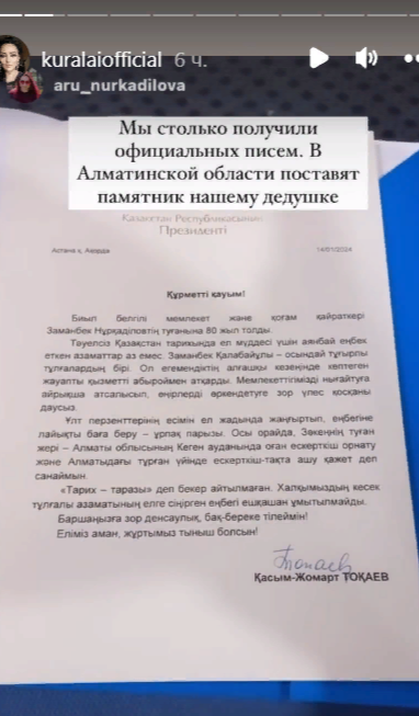بيىل بەلگىلى مەملەكەت قايراتكەرى زامانبەك ءنۇرقادىلوۆتىڭ تۋعانىنا 80 جىل تولدى. وسىعان وراي ق ر پرەزيدەنتى قاسىم-جومارت توقايەۆ قايراتكەردىڭ تۋىستارىنا حات جولدادى. حاتتىڭ كوشىرمەسىن زامانبەك ءنۇرقادىلوۆتىڭ قىزى قۇرالاي ءنۇرقادىلوۆا ءوزىنىڭ ينستاگرام پاراقشاسىندا جاريالادى.